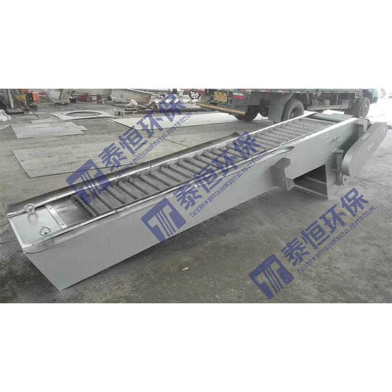 回轉(zhuǎn)式格柵除污機(jī)設(shè)備是由一種獨(dú)特的耙齒廠裝配成一組回轉(zhuǎn)格柵鏈。在電機(jī)減速器的驅(qū)動下,耙齒鏈進(jìn)行逆水流方向回轉(zhuǎn)運(yùn)動。耙齒鏈運(yùn)轉(zhuǎn)到設(shè)備的上部時,由于槽輪和彎軌的導(dǎo)向,使每組耙齒之間產(chǎn)生相對自清運(yùn)動,絕大部分固體物質(zhì)靠重力落下。另一部分則依靠清掃器的反向運(yùn)動把粘在耙齒上的雜物清掃干凈。按水流方向耙齒鏈類同于格柵,在耙齒鏈軸上裝配的耙齒間隙可以根據(jù)使用條件進(jìn)行選擇。當(dāng)耙齒把流體中的固態(tài)懸浮物分離后可以保持水流暢通流過。整個工作過程是連續(xù)的,也可以是間歇的。